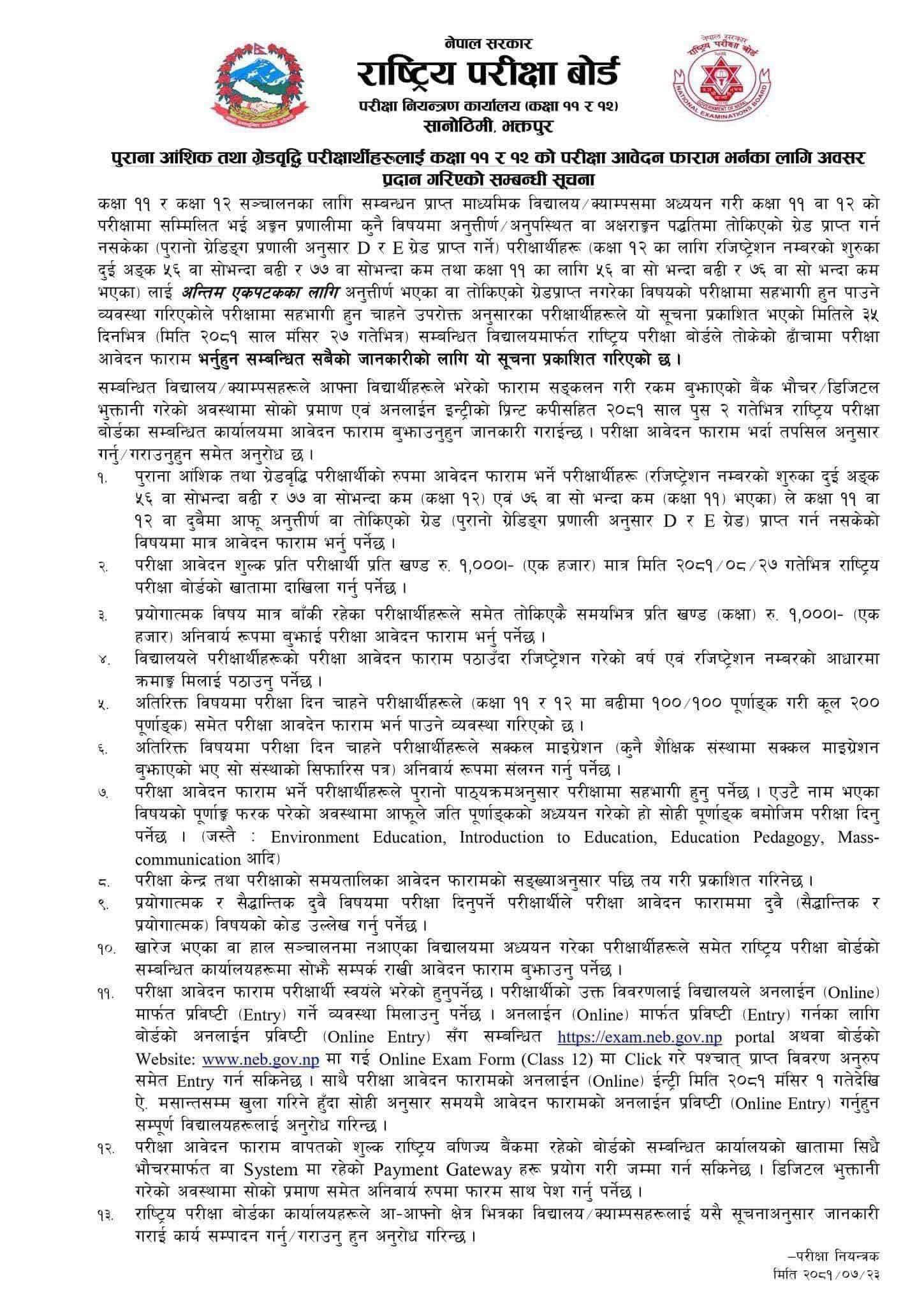 राष्ट्रिय परीक्षा बोर्डले ५६ सालदेखि हालसम्म फेल भएका विद्यार्थीहरुलाई पुन: परीक्षा दिन पाउने व्यवस्था गरेको हो ।
