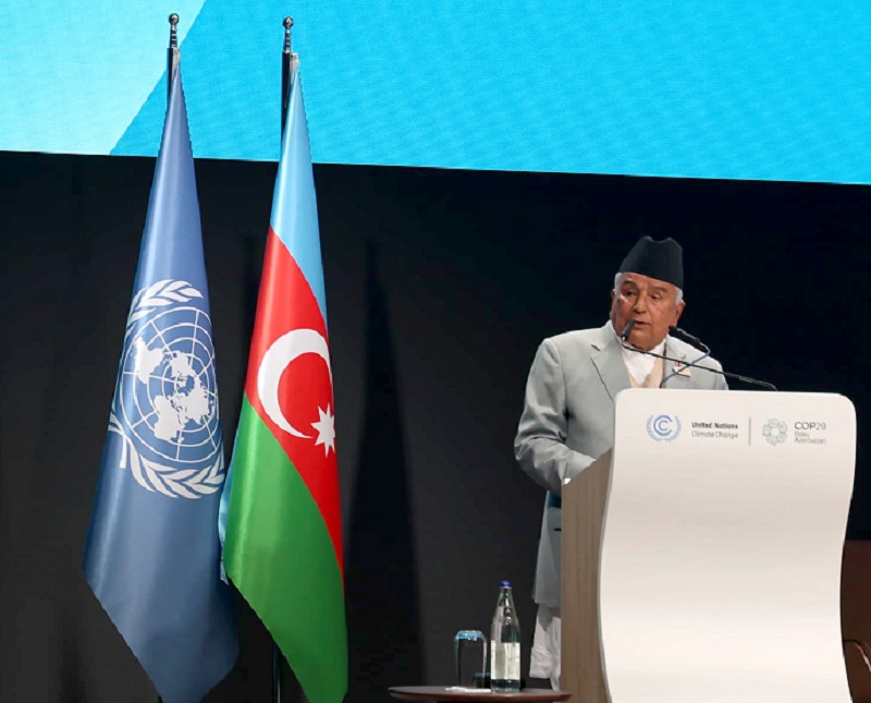 अजरबैजानको बाकुमा चलिरहेको जलवायु परिवर्तनसम्बन्धी संयुक्त राष्ट्रसङ्घीय संरचना महासन्धि पक्ष राष्ट्रहरुको २९ औँ सम्मेलन (कोप–२९) मा विश्व नेताहरूको उच्च स्तरीय सत्रलाई सम्बोधन गर्दै उहाँले पर्वतीय देशका सेता हिमाल काला पहाडमा परिणत हुने क्रमले ती देश मात्र होइन तल्लो तटीय देशलाई पनि सङ्कटमा पुर्याउँछ भन्ने विश्वले बिर्सन नहुनेमा जोड दिनुभयो ।