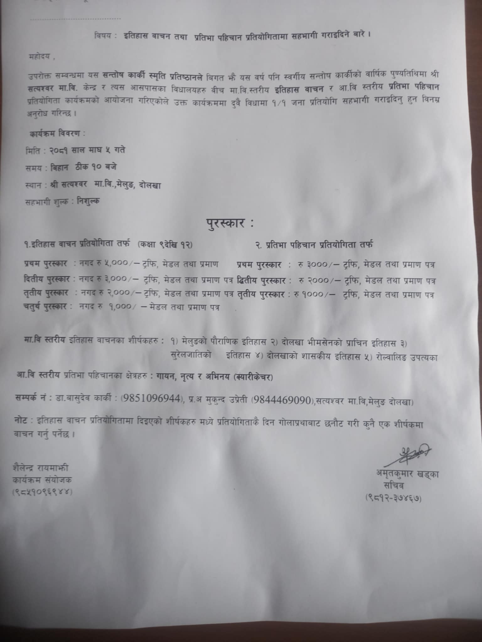 आगामी माघ ५ गते दोलखाको सत्यश्वर माविमा इतिहास वाचन तथा प्रतिभा पहिचान कार्यक्रम हुने प्रतिष्ठानका सचिव अमृतकुमार खड्काले जानकारी दिए । उनका अनुसार मावि स्तरीय इतिहास वाचन र आवि स्तरीय प्रतिभा पहिचान प्रतियोगीता कार्यक्रमको आयोजना गरिने छ । प्रतियोगीतामा प्रथम, द्धितीय, तृतीय र चतुर्थलाई नदग, ट्रफि, मेडल तथा प्रमाणपत्र उपलब्ध गराईने छ ।