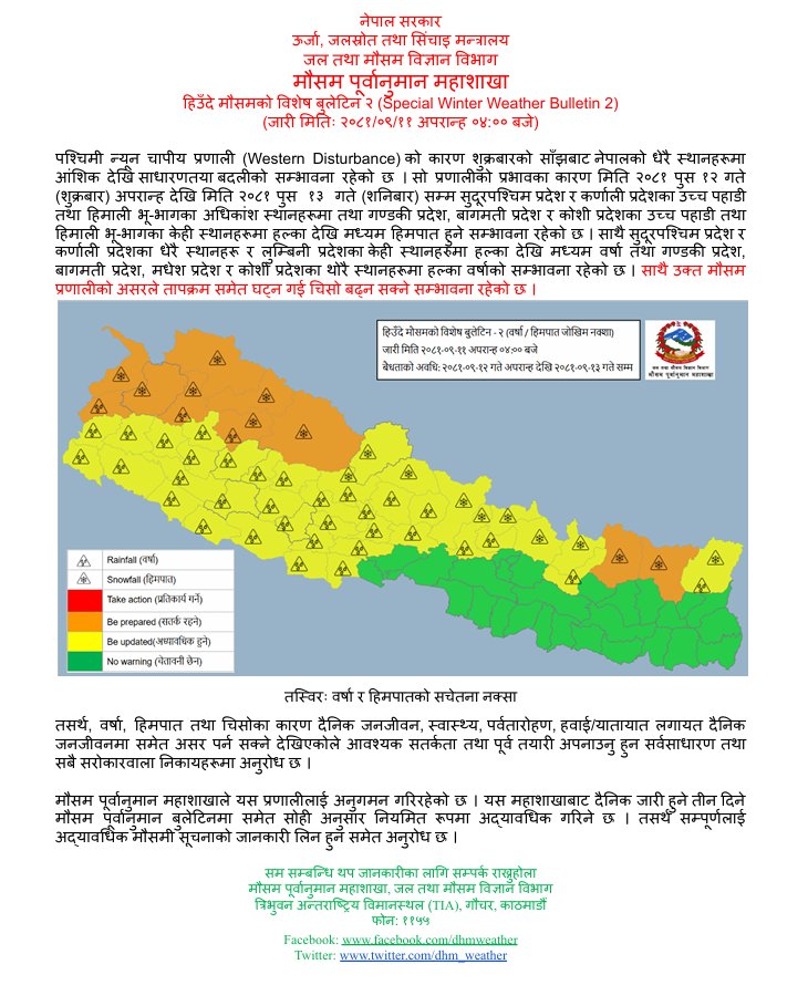 त्यसैगरी आवश्यक तयारी गर्न सरोकारवाला निकायलाई पनि भनिएको छ । पश्चिमी न्यूनचापीय प्रणालीको प्रभावले गएको सोमवार र मंगलवार देशका केही ठाउँमा फाट्टफुट्ट वर्षा तथा उच्च पहाडी र हिमाली क्षेत्रमा हिमपात भएको थियो । पर्याप्त हिउँदे वर्षा र हिमपात भएमा हिउँदे खेतीबालीलाई फाइदा पुग्नेछ ।
