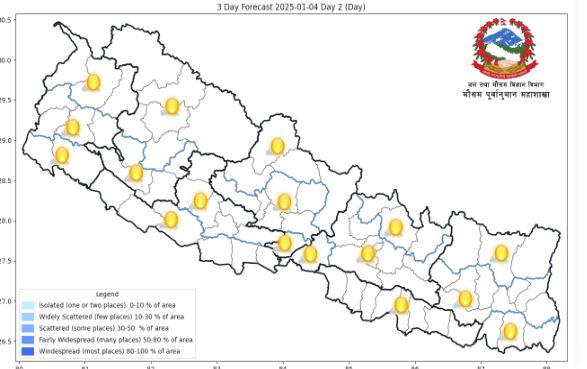 दिउँसो देशैभरका हिमाली, पहाडी र तराइकाे को मौसम मुख्यतया सफा रहने सम्भावना रहनेछ । राती भने गण्डकी, कर्णाली र सुदुरपश्चिम प्रदेशका हिमाली क्षेत्रमा र लुम्बिनी प्रदेशका पहाडी क्षेत्रमा आंंशिक बदली रही फाटफूट देखि हल्का वर्षाको सम्भावना रहेको छ । तर, पहाडी र तराई क्षेत्रमा भने मौसम सफा रहने सम्भावना रहेको छ ।