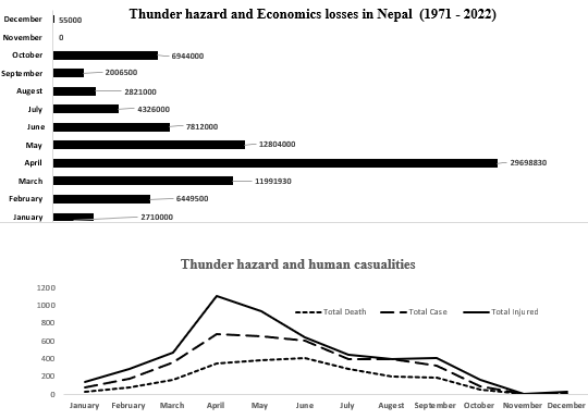 नेपालमा अप्रिल महिनादेखि तापक्रम बढ्न थाल्छ। बढ्दो तापक्रमसँगै मेघ गर्जन बढ्दै गएको र अप्रिल महिनामा ३४ प्रतिशत आर्थिक क्षति भएको रेकर्डले देखाएको छ।