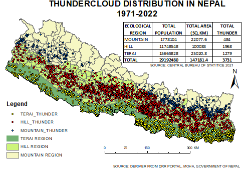 हालको अध्ययन नयाँ सात प्रदेश र पर्यावरणीय क्षेत्रका आधारमा गरिएको हो। ५२ वर्षको अवधि (सन १९७१ देखि सन् २०२२)मा नेपालभित्र घटेका जम्मा कुल घटना संख्याको आधारमा अमेरिकी पर्यावरण प्रणाली अनुसन्धान संस्थान (इएसआरआई)ले विकास गरेको एआरसी म्याप विधिको प्रयोग गरेर विश्लेषण गरिएको हो। यो विश्लेषणबाट निस्केको नतिजा भनेको प्रि-मनसुन र मनसुन अवधिमा मेघगर्जनको उच्च घनत्व रहेको छ।