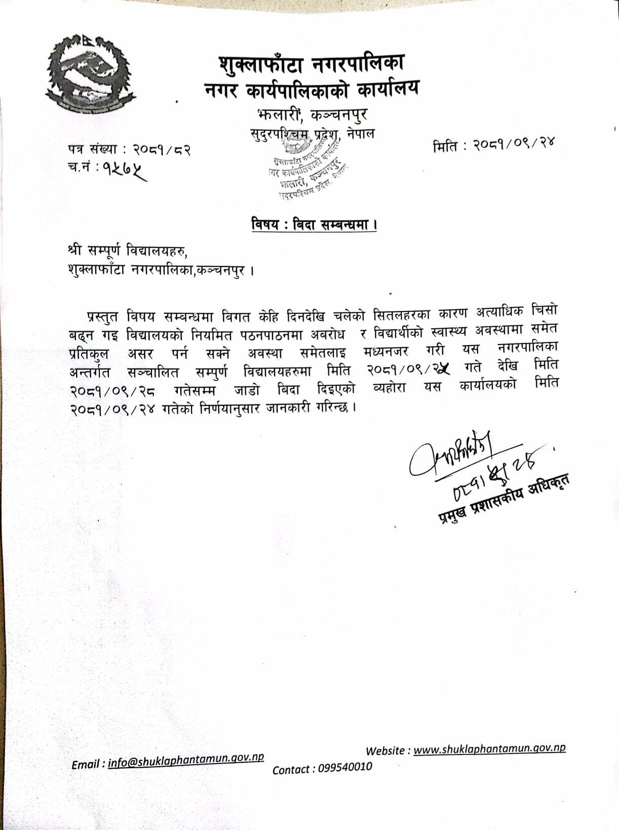 बिदा आज २५ गतेदेखि यहि महिनाको २८ गतेसम्म हुनेछ । ४ दिनको अवधिमा सम्पूर्ण शैक्षिक संस्था बन्द गरि चिसोबाट जोगिन नगरपालिकाले अनुरोध समेत गरेको छ ।