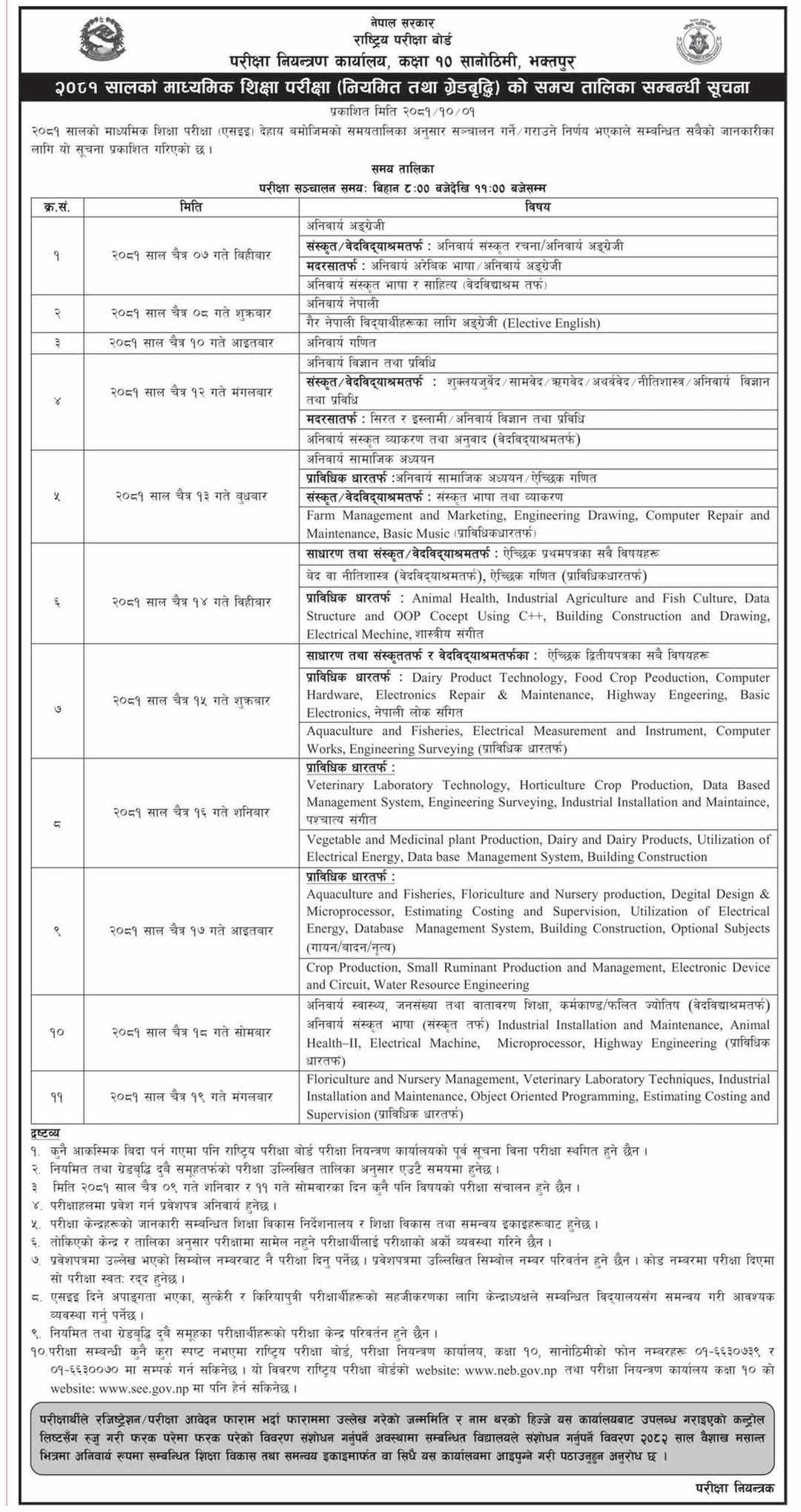 काठमाडौँ – राष्ट्रिय परीक्षा बोर्ड परीक्षा नियन्त्रण कार्यालय कक्षा १० ले शैक्षिक सत्र २०८१ को माध्यमिक शिक्षा परीक्षा (एसईई) को समयतालिका सार्वजनिक गरेको छ । सार्वजनिक तालिका अनुसार एसईई चैत ७ गतेदेखि हुने भएको छ । परीक्षा बिहान ८ बजेदेखि ११ बजेसम्म चल्ने छ ।