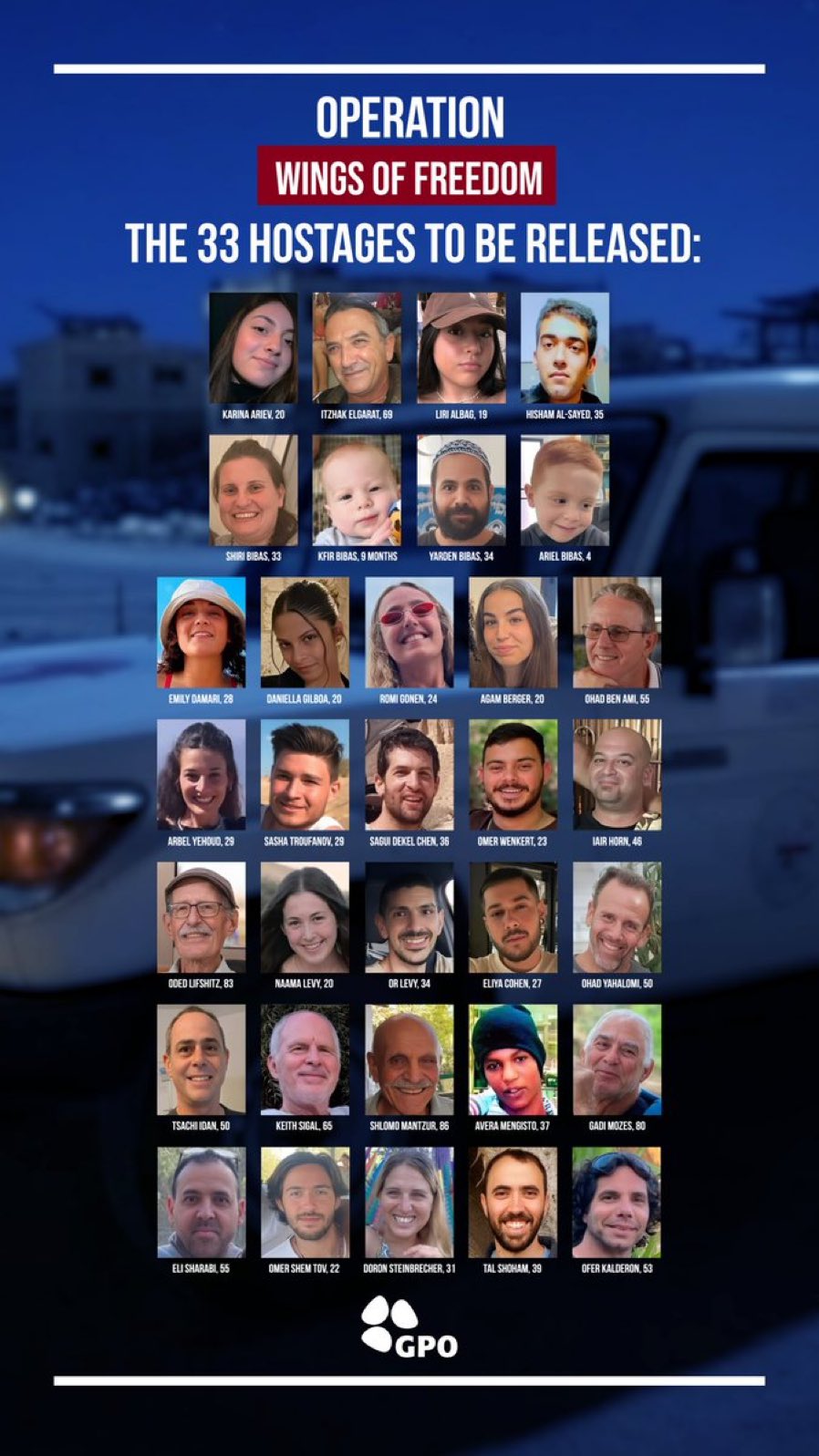 यो सूचीमा समावेश बन्धकमध्ये सबैभन्दा कान्छा र पाका व्यक्ति छन्, जसलाई अक्टोबर ७ २०२३ मा अपहरण गरिएको थियो। प्रकाशित सूचीअनुसार नौ महिनाको उमेरमा अपहरण गरिएका कफिर बिबास छन्। त्यस्तै, ८६ वर्षका श्लोमो मान्जुर अपहरण गरिएका सबैभन्दा वृद्ध व्यक्ति छन्। उनीहरू पहिलो चरणमा रिहा हुने बन्धकहरूमा सूचीमा रहेको एजेन्सीहरूले दाबी गरेका छन्। इजरायलले हालसालै युद्धविरामको घोषणा गरेको थियो। युद्धविरामको घोषणा कार्यान्वयन आइतबारबाट हुने जनाइएको थियो।