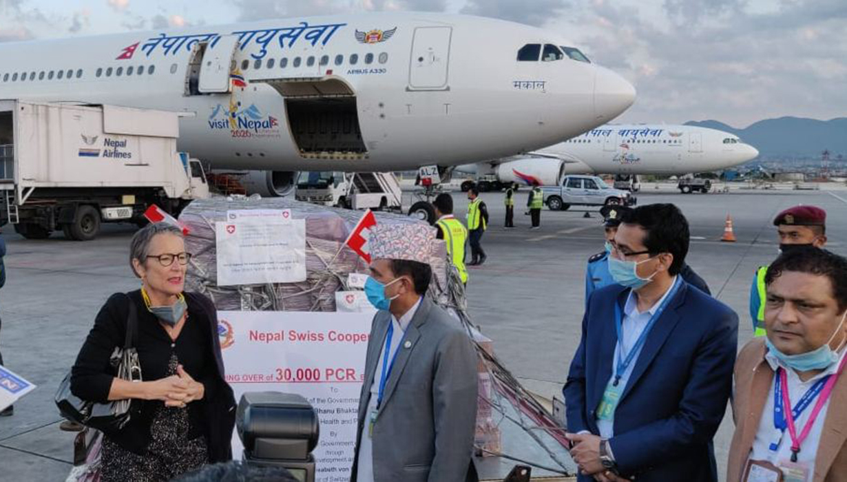बिहीबार पीसीआर टेस्ट किटसहित स्वीटजरल्याण्ड सरकार विकास सहयोग एसडीसीले गरेको अन्य स्वास्थ्य सामग्री नेपाल वायु सेवा निगमको वाइडबडी विमानमार्फत नेपाल आइपुगेको हो ।