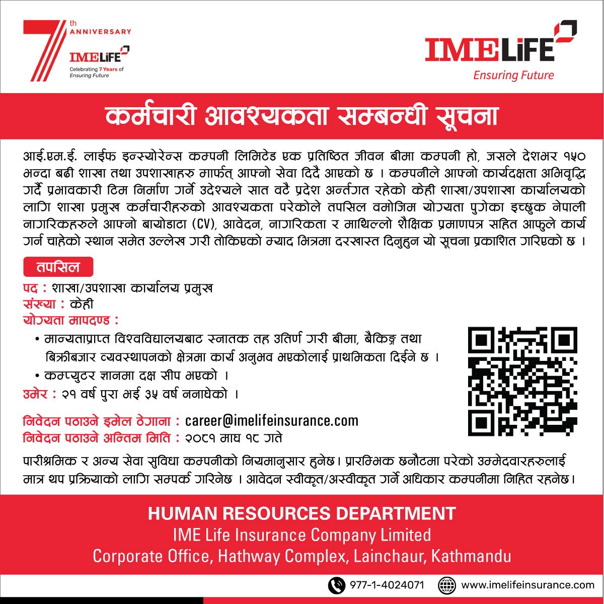 काठमाडौं – आइएमई लाइफ इन्स्योरेन्स कम्पनी लिमिटेडले सातै प्रदेशका लागि शाखा र उपशाखा प्रमुख पदको लागि कर्मचारीको माग गरेको छ । सो पदमा आवेदन दिनका लागि अबको एक हप्ता भित्र आवेदन दिनु पर्ने हुन्छ ।