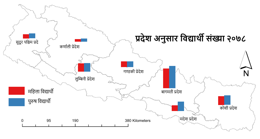 यी तिनै ठूला प्रदेशमा महिलाभन्दा पुरुष धेरै छन्। मधेश प्रदेश चौथो ठूलो विद्यार्थी संख्या बढी भएको प्रदेश हो तर महिला र पुरुषबीच ठूलो विभेद देखिन्छ। त्यहाँ देशको झन्डै १३ प्रतिशत (५,०३,८५० विद्यार्थी संख्या) विद्यार्थी संख्या रहेकोमा जम्मा ३७ प्रतिशत महिला रहेका छन्। सबैभन्दा कम विद्यार्थी संख्या भएको प्रदेश कर्णाली हो र त्यहाँ देशको कुल विद्यार्थी संख्याको ४.६ प्रतिशत (१,८३,३३३ विद्यार्थी संख्या) रहेका छन्। गण्डकी प्रदेश मात्र त्यस्तो प्रदेश हो, जहाँ महिला विद्यार्थी संख्याको ५०.१४ प्रतिशत अर्थात पुरुषको भन्दा बढी रहेको छ।