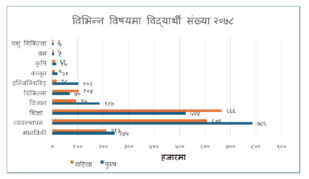 यी विभिन्न विषयगत हिसाबले हेर्दा सबैभन्दा धेरै विद्यार्थी व्यवस्थापन विषयमा रहेको देखिन्छ। व्यवस्थापन विषयमा ७ लाख ८६ हजार पुरुष र ६ लाख ८ हजार महिला रहेका छन्। दोस्रो, धेरै विद्यार्थी भएको विषय शिक्षा हो, जहाँ पुरुषभन्दा महिलाको संख्या बढी छ। यस विषयमा ६ लाख ६६ हजार महिला छन् भने ५ लाख २४ हजार पुरुष विद्यार्थी रहेका छन्। मानविकी तेस्रो धेरै विद्यार्थी भएको विषय हो र यहाँ पनि पुरुष विद्यार्थीको नै अधिकता रहेको छ। विज्ञान र इन्जिनियरिङ विषयमा महिला र पुरुषको अनुपात अधिक विषम रहेको छ। तर, समाजले उच्च सम्मान गर्ने विषय चिकित्साशात्रमा भने महिलाको संख्या धेरै रहेको छ।