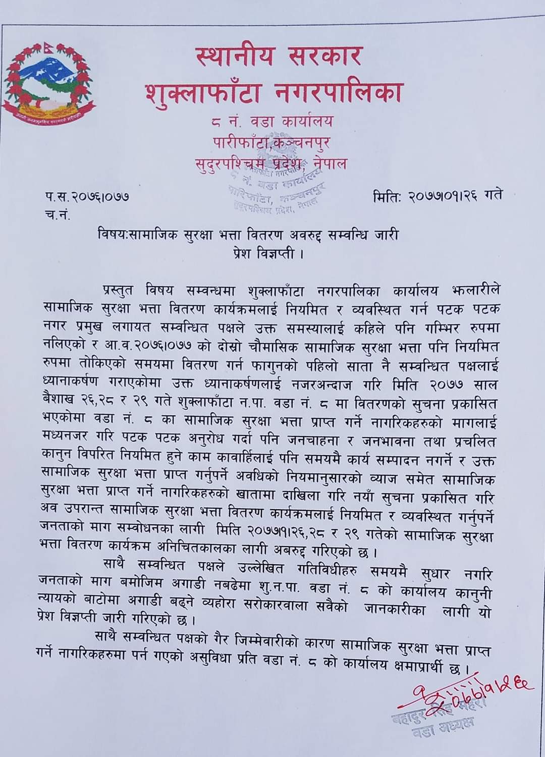 कञ्चनपुरकाे शुक्लाफाँटा नगरपालिका वडा नं ८ का अध्यक्ष बहादुरसिँह महराले वडावासिलाई सामाजिक सुरक्षा भत्ता वितरणमा बैंकले ढिलाई गरेकाे भन्दै बृद्धभत्ता व्याजसहित पाउनुपर्ने अडान राखेका छन ।