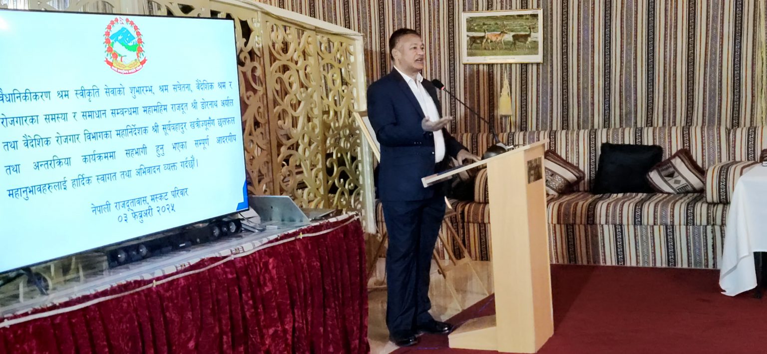 विभिन्न माध्यमबाट ओमान पुगेका तर श्रम स्वीकृति नभएका नेपालीलाईराजदूत डोरनाथ अर्याल र वैदेशिक रोजगार विभागका महानिर्देशक सूर्यबहादुर खत्रीले संयुक्त रुपमा श्रम स्वीकृति प्रदान गर्नुभएको हो ।