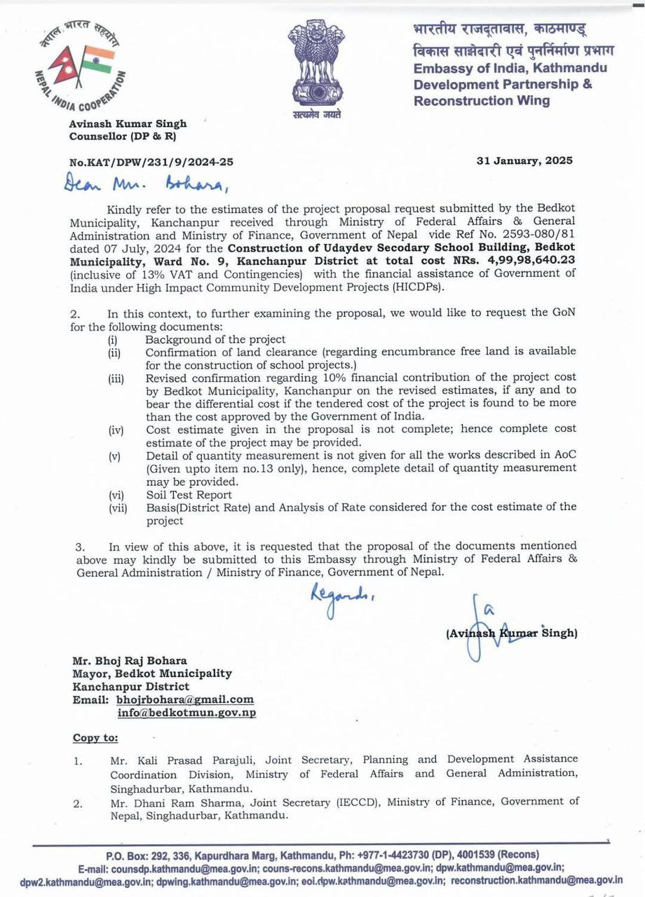 बेदकोट नगरका मेयर भोजराज बोहराले नगरका सामुदायिक विद्यालयको स्तर बृद्धिका लागि पूर्वाधार निर्माण गर्न दुताबासमा उदयदेव मावि र शारदा मावि दुई विद्यालयको प्रपोजल पेश गरेको बताए ।