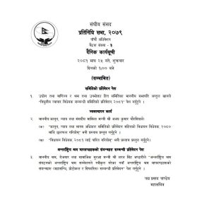 कानुन, न्याय तथा संसदीय मामिला मन्त्री अजयकुमार चौरसियाले ‘कानुन, न्याय तथा मानवअधिकार समितिको प्रतिबेदन सहितको बिधायन विधेयक, २०८० माथी छलफल गरियोस’ भन्ने प्रस्ताव प्रस्तुत गर्नेछन् भने ‘बिधायन बिधेयक, २०८१लाइ पारित गरियोस्’ भनी प्रस्ताव प्रस्तुत गर्नेछन् । उता, श्रम, रोजगार तथा सामाजिक सुरक्षा मन्त्री शरतसिंह भण्डारीले ‘अन्तराष्ट्रिय श्रम संगठनको अन्तराष्ट्रिय श्रम सम्मेलनले स्विकृत गरेका नयाँ अन्तराष्ट्रिय श्रम मापदण्डहरूको संयन्त्रहरू (महासन्धि, प्रोटोकल र सिफारिस) सबन्धी प्रतिबेदन पेश गर्ने सम्भावित कार्यसुचीमा उल्लेख गरिएको छ।