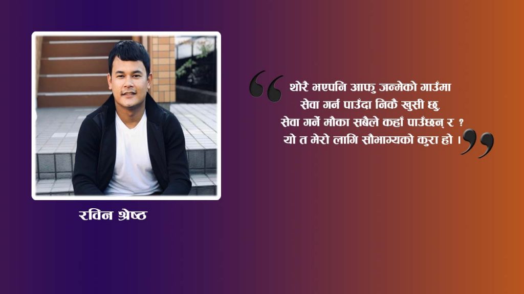 काठमाडाैँ – भनिन्छ सहयोग गर्न ठूलो धन हैन ठूलो मन चाहिन्छ, मन भएपछि विदेशमा बसेर पनि नेपालमा सेवा गर्न सकिन्छ भन्ने उदाहरण हुन् रविन श्रेष्ठ । श्रेष्ठ गोरखाको गण्डकी गाउँपालिका, मकैसिंग पोखरीका स्थायी बासिन्दा हुन् । उनी हाल जापानमा बस्दै आएका छन् । वि.सं. २०७० सालमा पढाइको लागि जापान गएका उनी सानै देखि सहयोगी भावनाका … Continue reading सहयोग गर्न ठूलो धन हैन ठूलो मन चाहिन्छ : रविन श्रेष्ठ