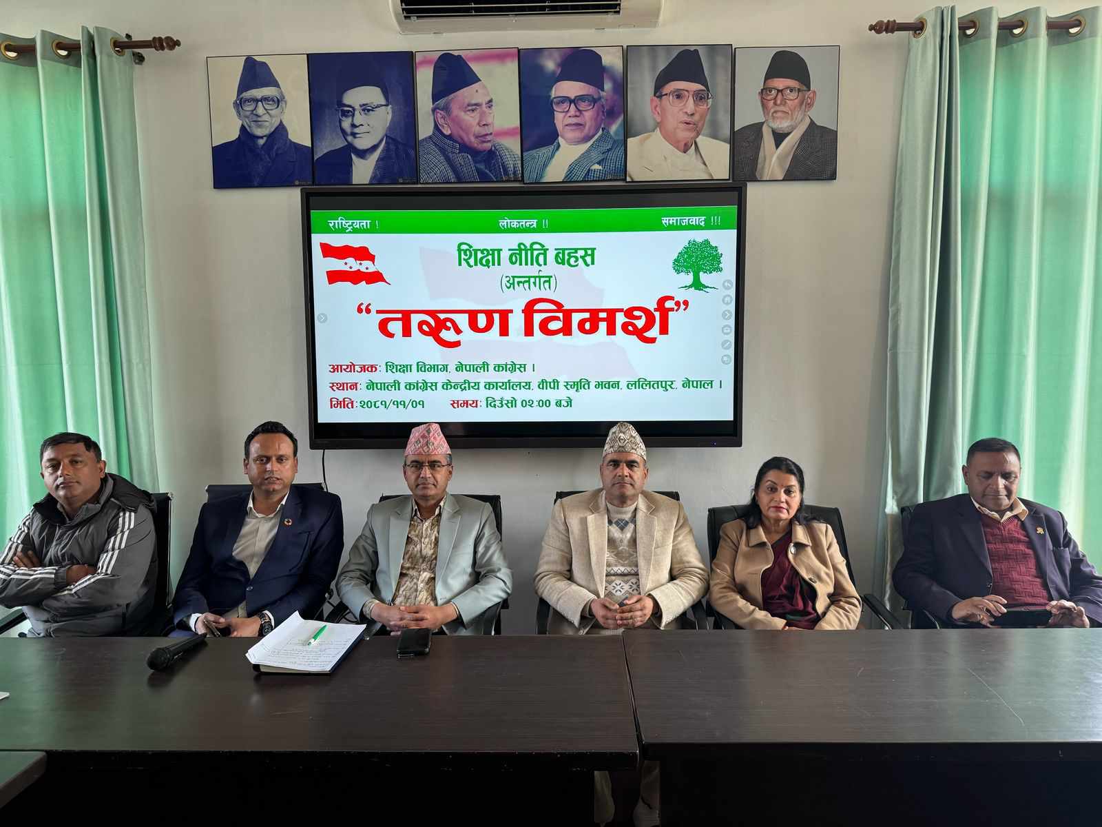 काठमाडौं। प्रमुख सत्तारुढ दल नेपाली कांग्रेसले शिक्षा नीति बहसअन्तर्गत तरुण विमर्श गरेको छ। केन्द्रीय सदस्य नैनसिंह महर नेतृत्वको शिक्षा विभागले आज पार्टी केन्द्रीय कार्यालय सानेपामा एक कार्यक्रमबीच तरुणहरूसँग शिक्षा नीति बहस गरेको हो।