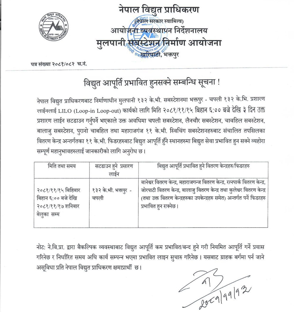 नेपाल विद्युत् प्राधिकरणले काठमाडौं उपत्यका पश्चिम वितरण प्रणाली सदृढीकरण आयोजना खरिपाटी, भक्तपुरका अनुसार बिहीबारदेखि विभिन्न ठाउँमा विद्युत् आपूर्ति अवरुद्ध हुने जानकारी दिएको छ ।