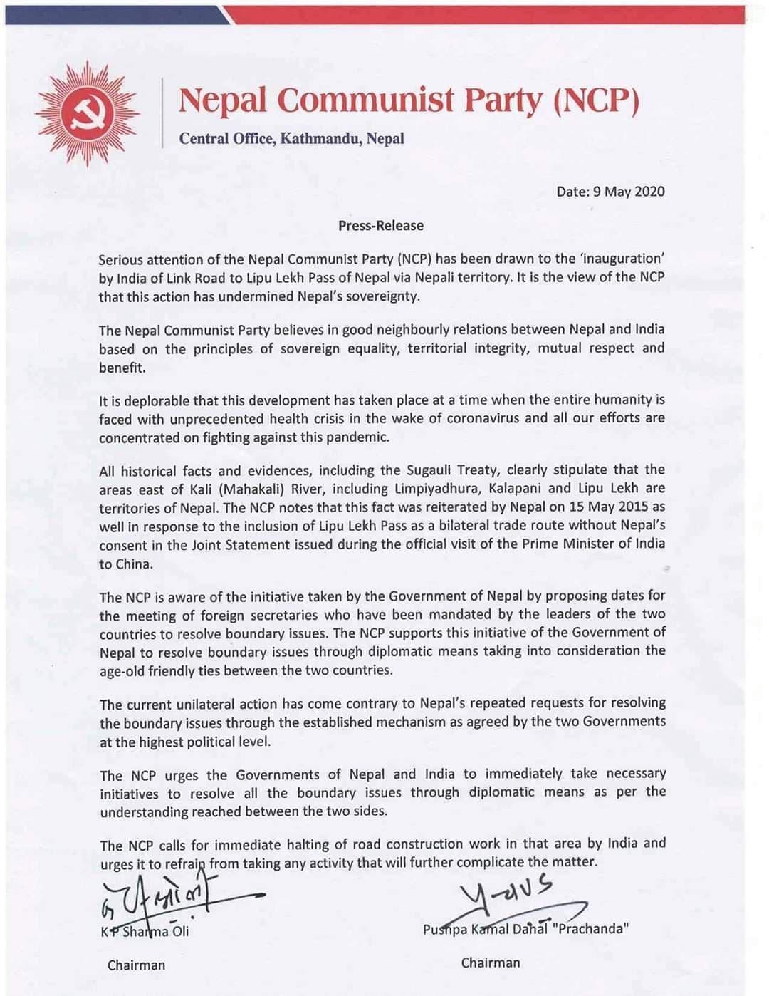 सत्तारुढ नेकपाका अध्यक्षद्वयको संयुक्त हस्ताक्षरमा शनिबार साँझ जारी विज्ञप्तिमा भारतको कदमप्रति आपत्ति जनाइएको छ ।