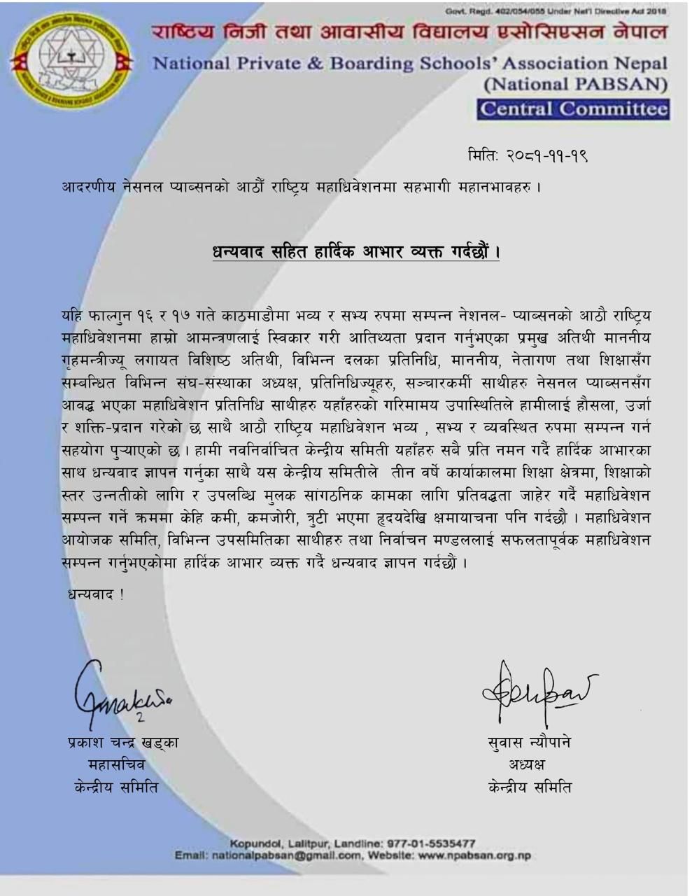 महाधिवेशनमा सहभागी तथा सहयोग गर्ने सम्पूर्ण महानुभावहरूलाई राष्ट्रिय प्याब्सनले हार्दिक आभार व्यक्त गरेको छ। विशेष गरी गृहमन्त्रीलगायत विशिष्ट अतिथिहरू, विभिन्न प्रदेशका प्रतिनिधिहरू, शिक्षा क्षेत्रका विज्ञहरू तथा सरोकारवाला निकायहरूको उपस्थितिलाई नेशनल प्याब्सनले महत्त्वपूर्ण ठानेको छ।