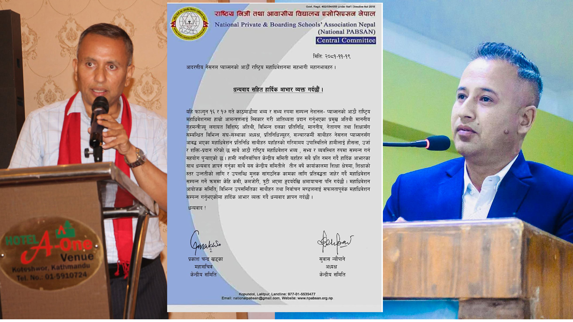 काठमाडौँ, फागुन १९ – राष्ट्रिय निजी तथा आवासीय विद्यालय एसोसिएसन नेपाल (नेशनल प्याब्सन) को आठौँ राष्ट्रिय महाधिवेशन भव्य रूपमा सम्पन्न भएको छ। फागुन १६ र १७ गते काठमाडौँमा सम्पन्न उक्त महाधिवेशनमा देशभरका निजी विद्यालयका प्रतिनिधिहरू, शिक्षाविद्हरू, सरोकारवाला निकायका पदाधिकारीहरू तथा विशिष्ट अतिथिहरूको उपस्थितिमा सफलतापूर्वक सम्पन्न भएको हो।