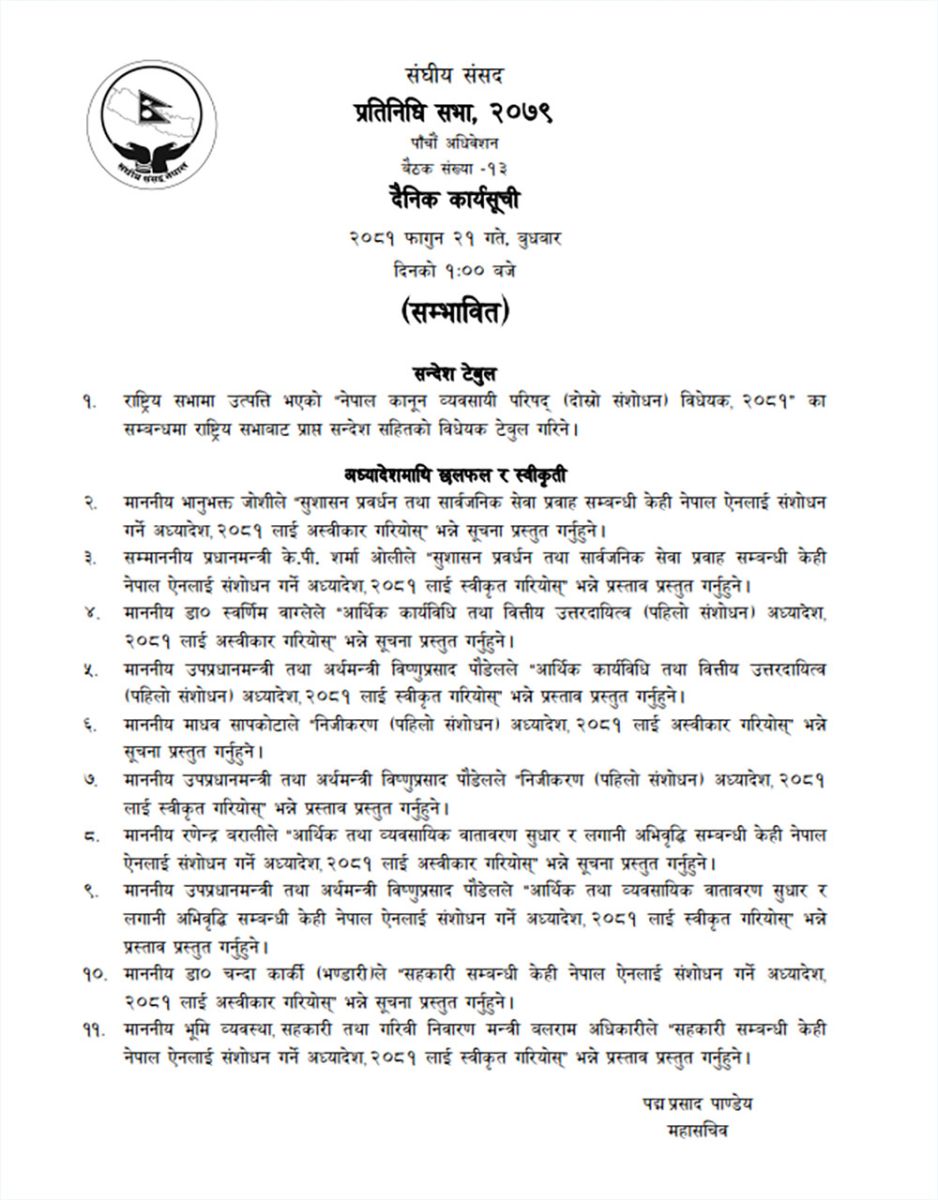 अपराहन्न १ बजेदेखि शुरु हुने बैठकमा सरकारले यस अघि संसदमा पेश गरेका विभिन्न पाँच अध्यादेशमाथि छलफल र स्वीकृतीका लागि पेश हुने संघीय संसदले सार्बजनिक गरेको आजको सम्भावित कार्यसूचीमा उल्लेख छ ।