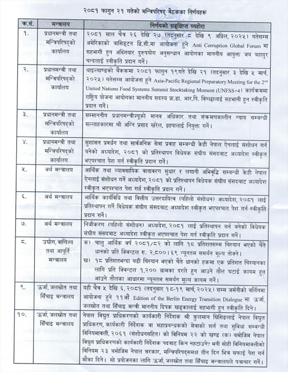 शुक्रबार मन्त्री गुरुङले सञ्चार मन्त्रालयमा आयोजित कार्यक्रममा फागुन २१ गते बसेको मन्त्रिपरिषद्को बैठकका निर्णयहरु सार्बजनिक गरेका हुन् । मन्त्रिपरिषद्को बैठकले गरेका विभिन्न १९ निर्णयहरु सार्बजनिक गरिएको छ ।