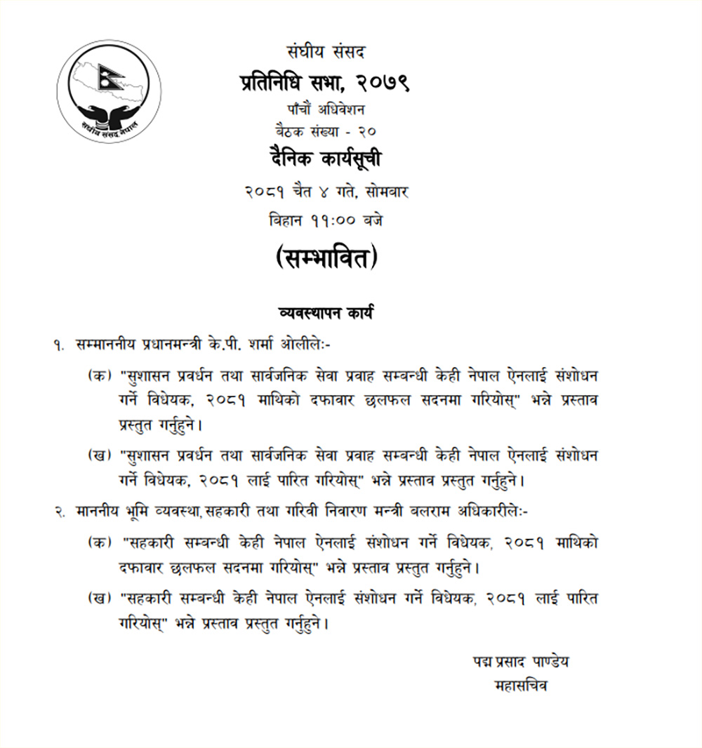 त्यस्तै आज भूमि व्यवस्था, सहकारी तथा गरिवी निवारण मन्त्री बलराम अधिकारीले ‘सहकारी सम्बन्धी केही नेपाल ऐनलाई संशोधन गर्ने विधेयक, २०८१ माथिको दफावार छलफल र पारित गरियोस्’ भन्ने प्रस्ताव प्रस्तुत गर्ने तालिका रहेको संसद सचिवालयले जनाएको छ ।