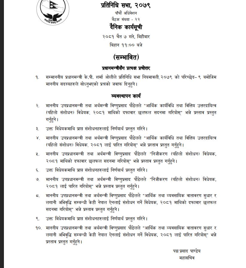 संसद सचिवालयका अनुसार आजको बैठकमा प्रधानमन्त्री केपी शर्मा ओलीसँग प्रश्नोत्तर कार्यक्रम हुनेछ भने उपप्रधान तथा अर्थमन्त्री बिष्णु पौडेलले तीनवटा बिधेयक प्रस्तुत गर्नेछन् ।