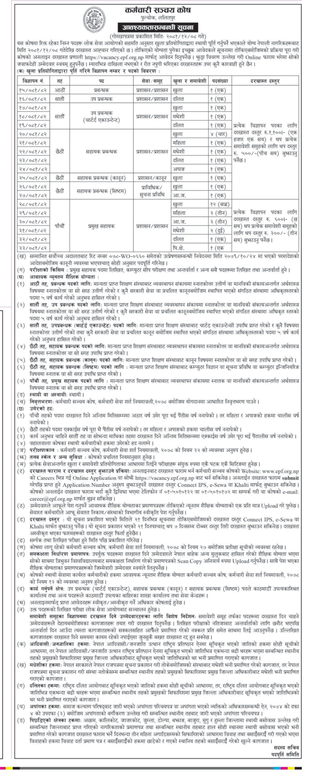 शुक्रबार गोरखापत्र दैनिकमा सूचना प्रकाशन गर्दै कोषले आठौं तहमा प्रबन्धकदेखि पाँचौं तहमा मुख्य सहायकसम्म कर्मचारी मागेको हो।