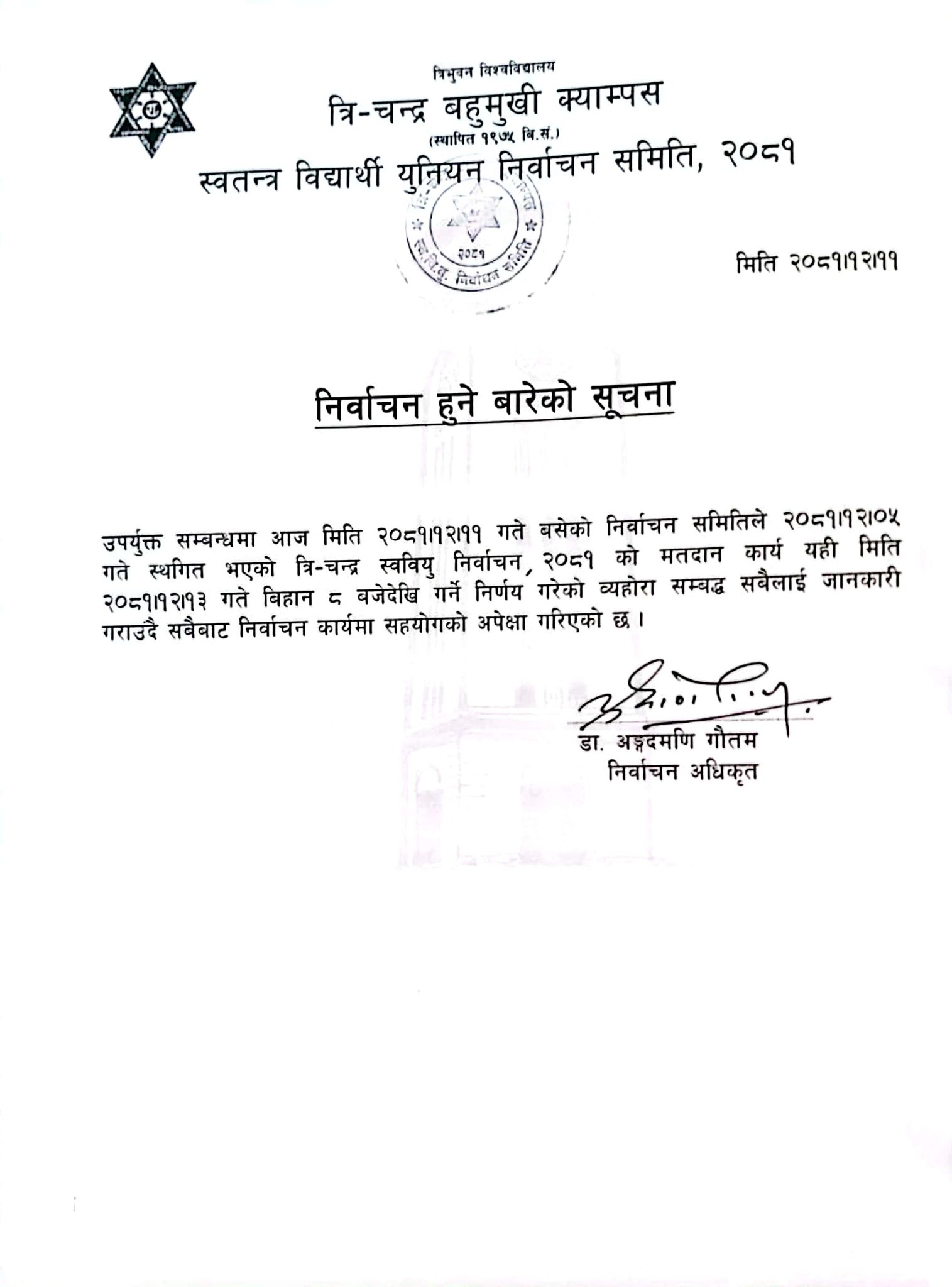 काठमाडौंको त्रिचन्द्र क्याम्पसमा यही चैत १३ गते स्ववियु निर्वाचन हुने भएको छ। चैत ५ गते स्ववियु निर्वाचन तोकिए पनि तालबन्दीका कारण स्थगित भएको थियो।निर्वाचन अधिकृत अङ्गदमणि गौतमले सोमबार निकालेको सूचनामा चैत १३ गते स्ववियु चुनाव हुने उल्लेख छ।