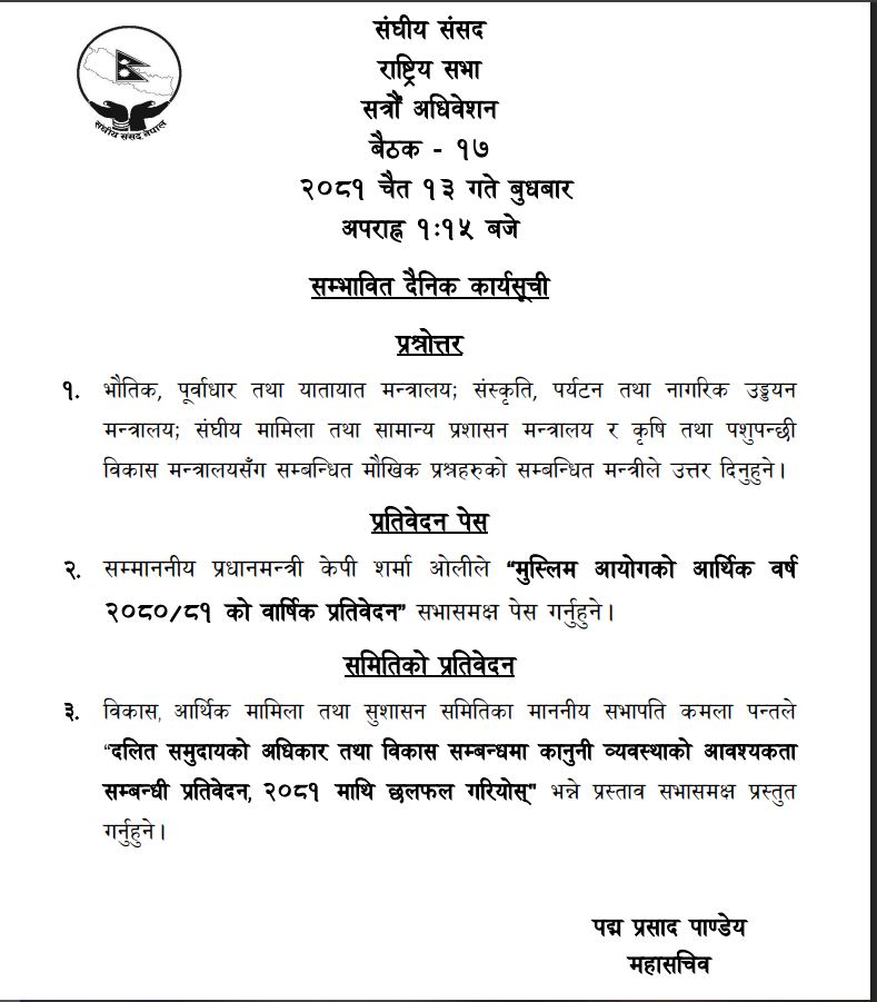 बैठकमा प्रधानमन्त्री केपी शर्मा ओलीले ‘मुस्लिम आयोगको आर्थिक बर्ष २०८०/८१ को बार्षिक प्रतिबेदन’ सभासमक्षा पेश गर्नेछन भने विकास, आर्थिक मामिला तथा सुशाषन समितिका सभापति कमला पन्तले ‘दलित समुदायको अधिकार तथा विकास सबन्धमा कानुनी ब्यवस्था आवाश्यक्ता सबन्धी प्रतिबेदन, २०८१ माथी छलफल गरियोस्’ भन्ने प्रस्ताव प्रस्तुत गर्ने सम्भावित कार्यसुचीमा उल्लेख गरिएको छ।