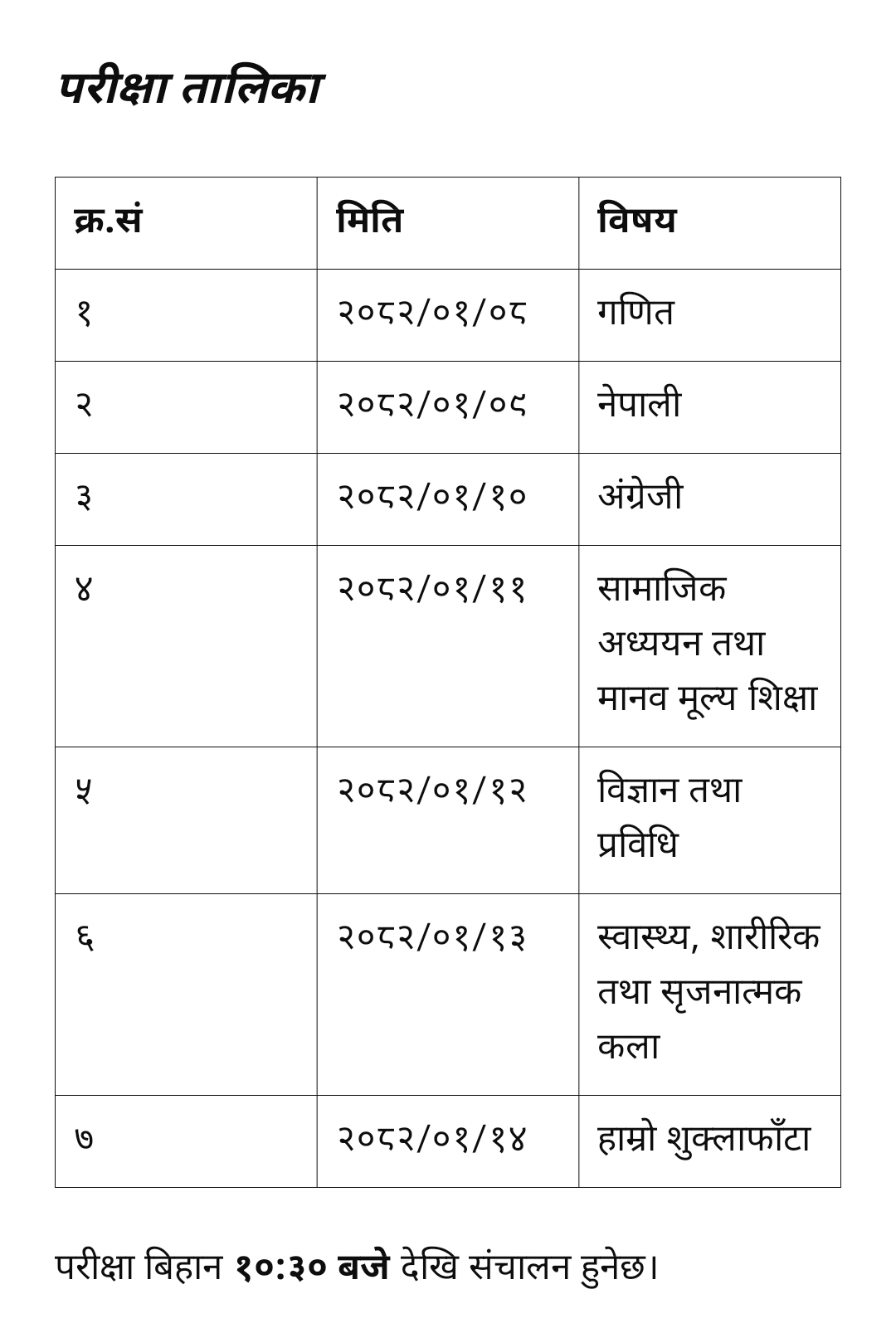 नगरपालिकाले परीक्षा केन्द्र सम्बन्धित विद्यालयहरूलाई जानकारी गराउने व्यवस्था मिलाएको छ। परीक्षा तालिका निम्नानुसार छः