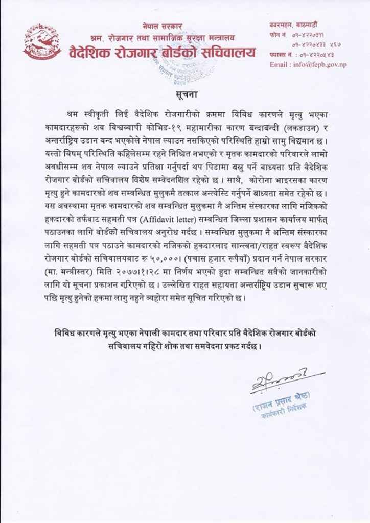 तर, वैदेशिक रोजगर बोर्डको सचिवालयले उनीहरुको शब विदशेमै अन्त्यष्टि गर्ने अनुमति दिन परिवारलाई बारम्बार आग्रह गर्दै आएको छ । बोर्डले सोमबार एक सूचना निकालेर विदेशमै रहेका आफ्ना नजिकका हकदारबाट अन्त्यष्टीका लागि सहमतिपत्र दिन आग्रह गरेको छ । श्रममन्त्री स्तरकै निर्णयबाट बोर्डले अन्तर्राष्ट्रिय उडानमा प्रतिवनध लागेपछि निधन भएका कामदारका परिवारलाई यस्तो सुविधा दिने निर्णय भएको बोर्डले जनाएको छ ।
