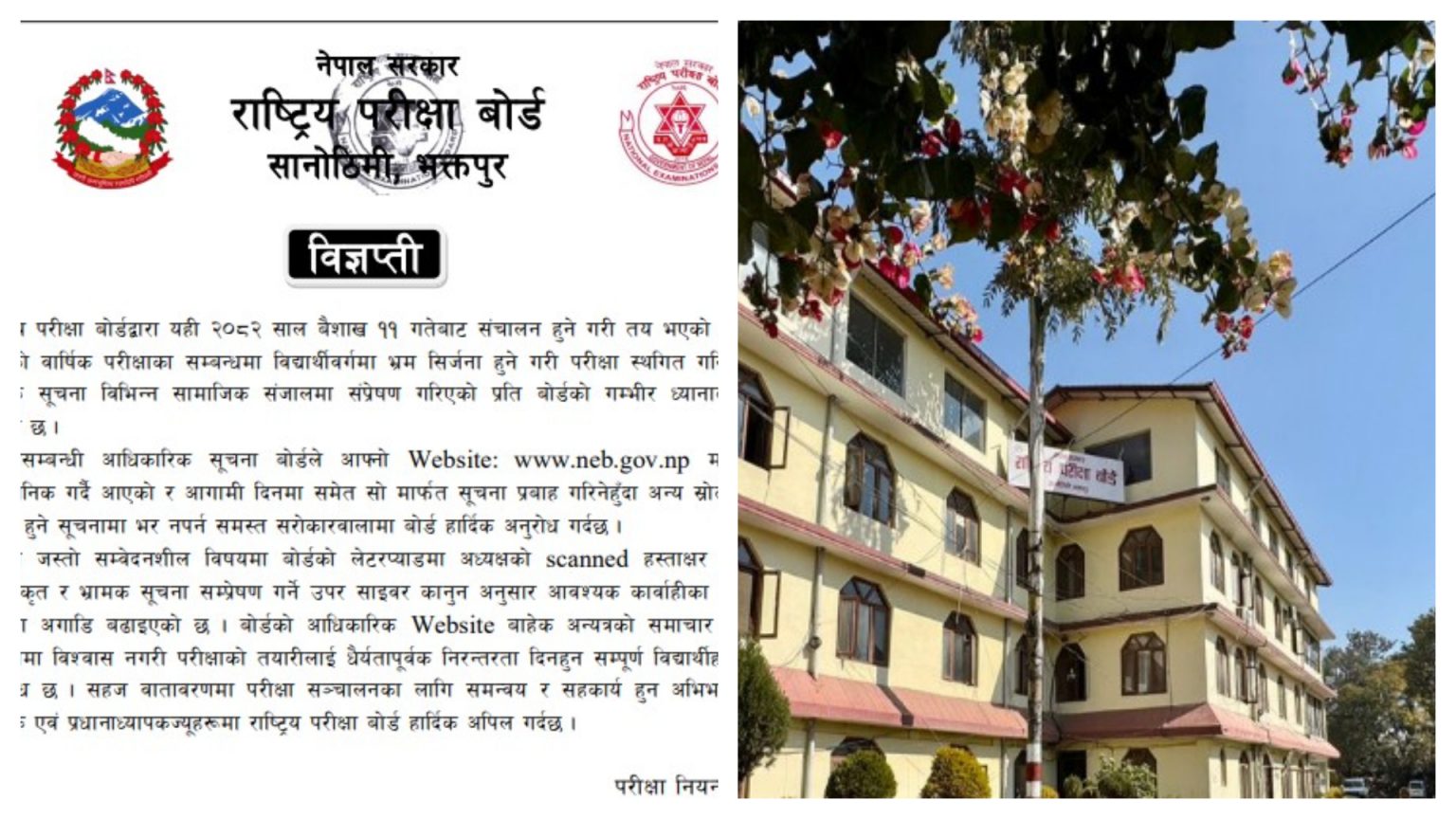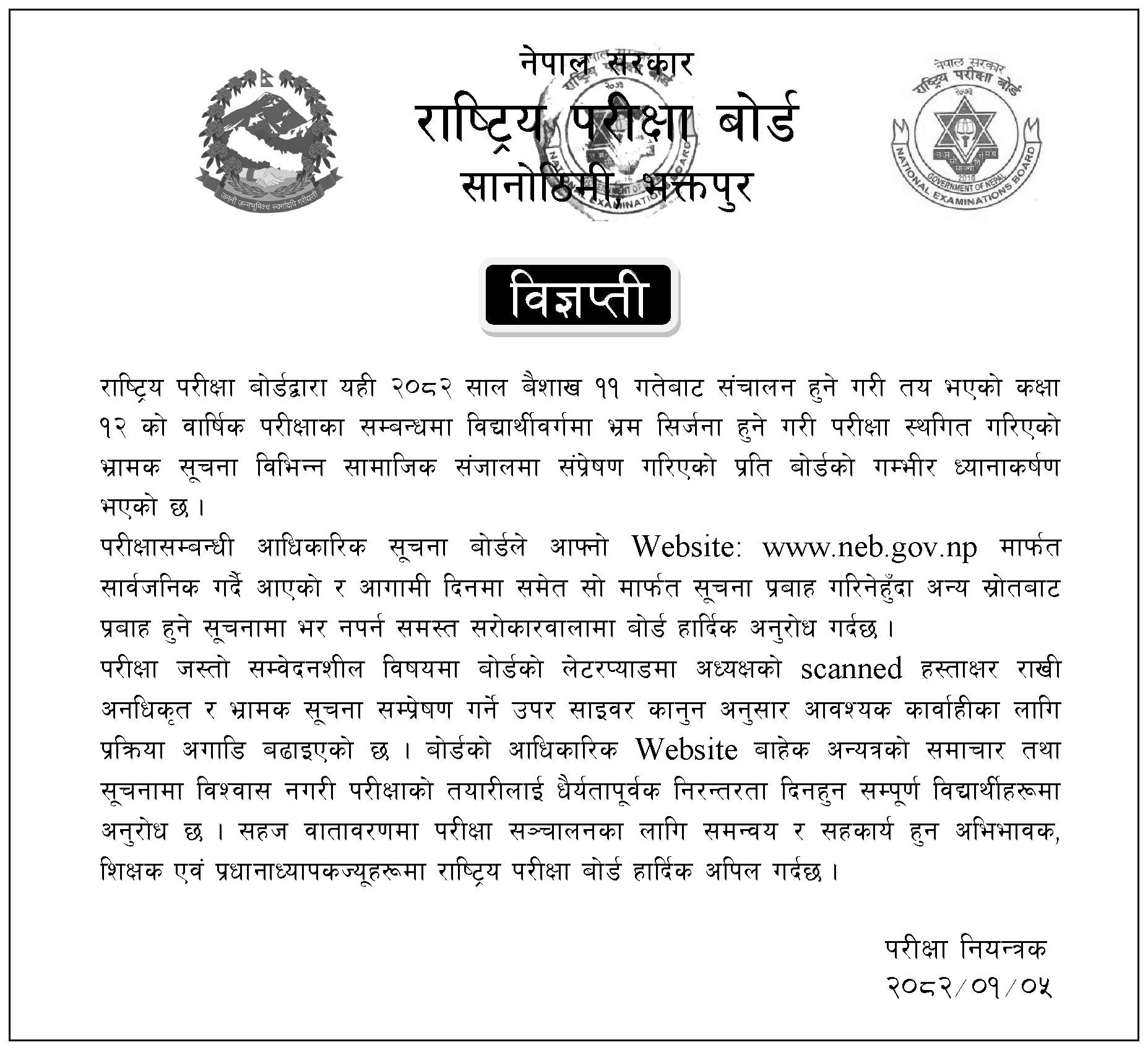 बोर्डको आधिकारिक वेबसाइट बाहेक अन्यत्रको समाचार तथा सूचनामा विश्वास नगरी परीक्षाको तयारीलाई धैर्यतापूर्वक निरन्तरता दिन सम्पूर्ण विद्यार्थीहरूमा बोर्डले अनुरोध गरेको छ ।