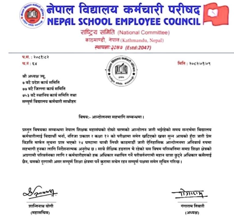 विद्यालय कर्मचारी परिषद्को यो निर्देशनसँगै मुलुकभरका विद्यालयहरूमा शैक्षिक गतिविधि थप प्रभावित हुने संकेत देखिएको छ।