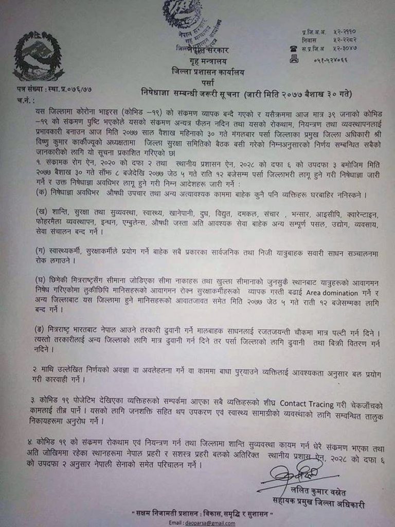 वीरगञ्ज – जिल्ला प्रशासन कार्यालय पर्साले मंगलबार साँझ ८ बजेदेखि जिल्लाभर निषेधाज्ञा जारी गरेको छ ।