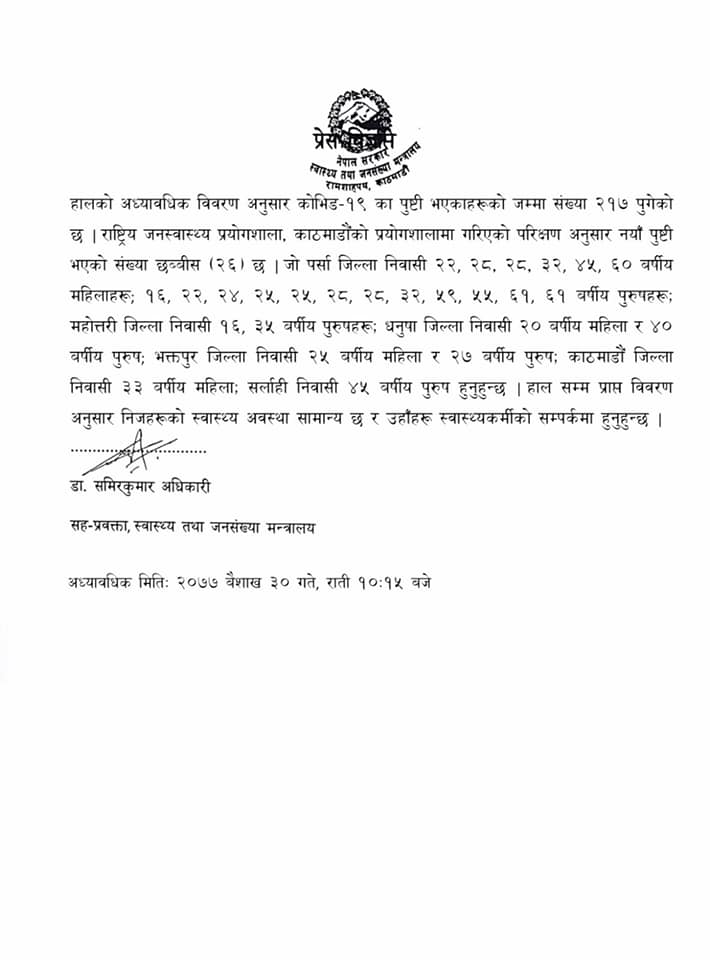 राष्ट्रिय प्रयोगशाला काठमााडौँमा परीक्षण गरिएका २६ जनामा कोरोना संक्रमण देखिएको हो ।