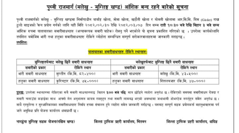 काठमाडौं — पृथ्वी राजमार्ग अन्तर्गत मलेखु–मुग्लिन सडकखण्ड आज जेठ ३० गतेदेखि असार ७ गतेसम्म राति १०:३० बजेदेखि बिहान ३ बजेसम्म सवारी आवागमन आंशिक बन्द हुने भएको छ।