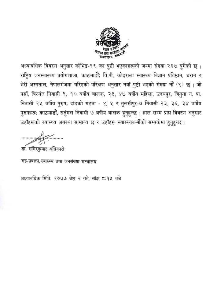 यस्तै उदयपुर त्रियुगा नागरपालिकाका २५ वर्षीय पुरुषमा पनि कोरोना संक्रमण देखिएको छ । यससँगै नेपालमा कुल संक्रमितको संख्या २६७ पुगेको छ ।