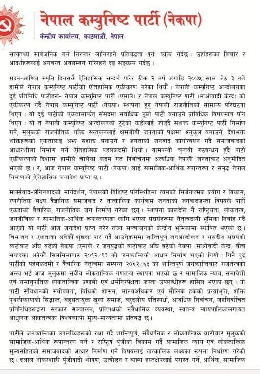 त्यस्तै ओली–प्रचण्डले मदन आश्रितका विचार र आदर्शलाई अनवरत अवलम्बन गर्ने दृढ संकल्प समेत गरेका छन् । मदन आश्रित स्मृति दिवसकै ऐतिहासिक सन्दर्भ २ बर्ष अगाडि २०७५ जेठ ३ गते ततकालिन एमाले र माओवादीबीच एकीकरण गरेर नेकपा बनेको थियो ।