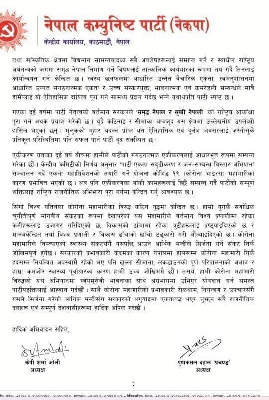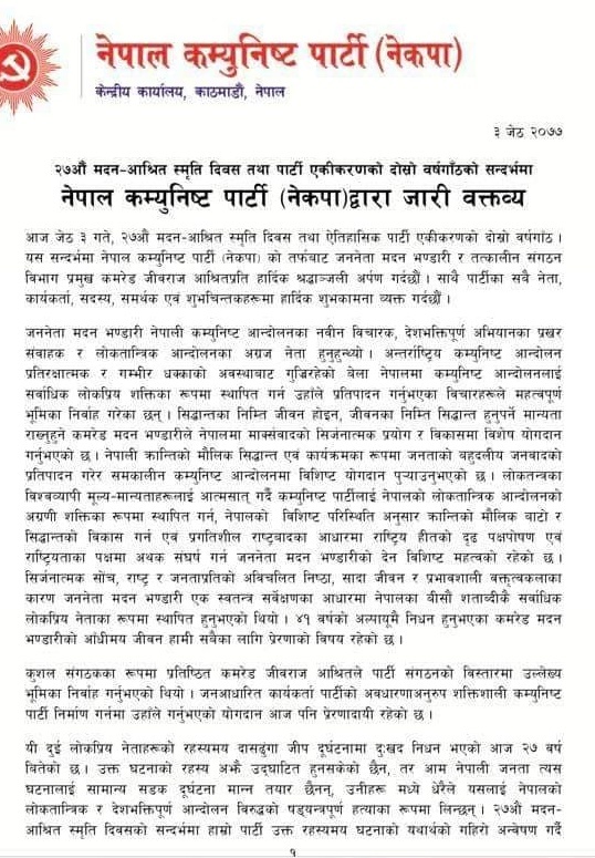 जननेता मदन भण्डारी र तत्कालीन संगठन विभाग प्रमुख जीवराज आश्रितको २०५० साल जेठ ३ गते दासढुंगा दुर्घटनामा मृत्यु भएको थियो । ओली प्रचण्डले जारी गरेको विज्ञप्तिमा भनिएको छ, ‘२७ औ मदनआश्रित स्मृति दिवसकोसन्दर्भमा हाम्रो पार्टी उक्त रहस्यमय घटनाको यथार्थको गहिरो अन्वेषण गर्दै सत्यतथ्य सार्वजनिक गर्न निरन्तर लागिरहने प्रतिवद्धता पुन व्यक्त गर्दछ ।’