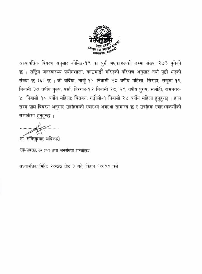बर्दिया, सिराहा, पर्सा, सर्लाही र चितवनमा गरी ६ जना संक्रमित थपिएका स्वास्थ्य तथा जनसंख्या मन्त्रालयले जनाएको छ । राष्ट्रिय जनस्वास्थ्य प्रयोगशाला काठमाडौमा गरिएको परीक्षणमा उनीहरुमा कोरोना संक्रमणको पुष्टि भएको हो । उनीहरुको स्वास्थ्य अवस्था सामान्य रहेको मन्त्रालयले जनाएको छ । यो सँगै कोरोना संक्रमितको संख्या २ सय ७३ पुगेको छ ।