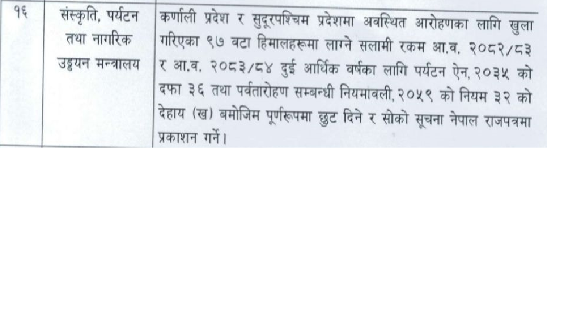 काठमाडौँ – नेपाल सरकारले सुदूरपश्चिम र कर्णाली प्रदेशका ९७ वटा हिमालहरूमा आरोहणका लागि लाग्ने दस्तुर—सलामी रकम (रोयल्टी) दुई आर्थिक वर्षका लागि पूर्णरूपमा छुट दिने निर्णय गरेको छ। संस्कृति, पर्यटन तथा नागरिक उड्डयन मन्त्रालयको प्रस्तावमा मन्त्रिपरिषद्ले उक्त निर्णय गरेको हो।