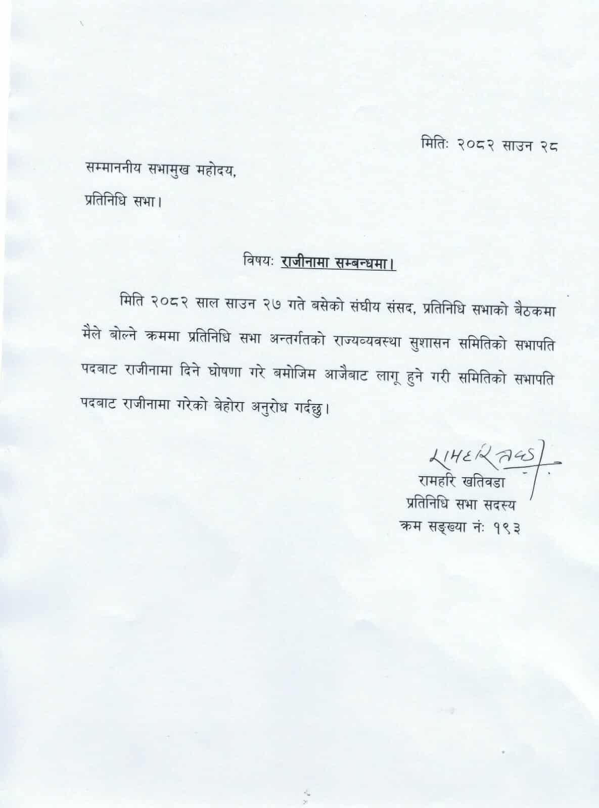 रामहरि खतिवडाले सभामुखलाई बुझाए राजीनामा