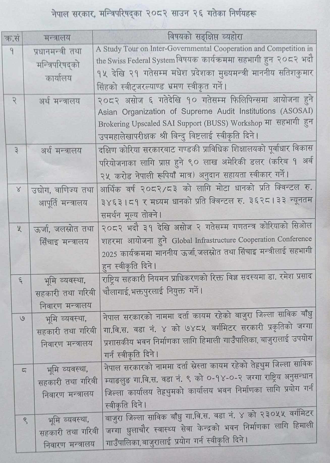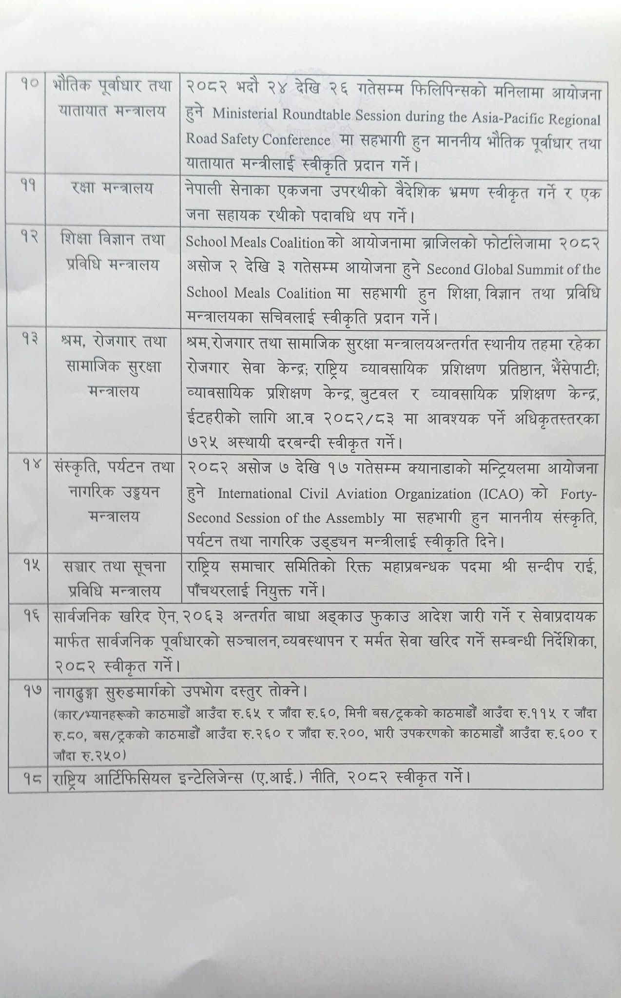 मन्त्री गुरुङका अनुसार बैठकले नागढुंगा सुरुङमार्गको उपभोग दस्तुर तोक्ने, सार्वजनिक खरिद ऐन, २०६३ अन्तर्गत बाधा अड्काउ फुकाऊ आदेश जारी गर्ने, राससको महाप्रबन्धकमा सन्दीप राईलाई नियुक्त गर्ने लगायतका १८ वटा निर्णयहरू गरेको छ। सरकारले स्वीकृत गरेको एआई नीति प्रविधिको सुरक्षित, जिम्मेवार र प्रभावकारी प्रयोगका लागि मार्गनिर्देशन हुने बताइएको छ।