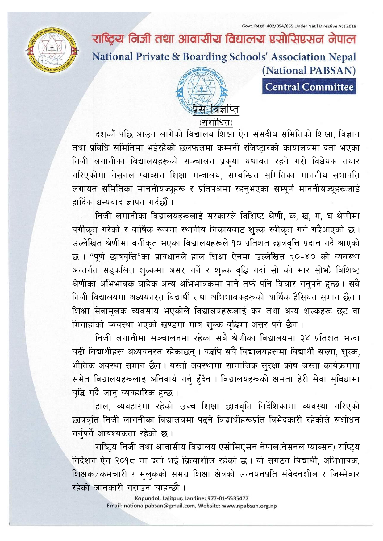 त्यस्तै, उच्च शिक्षा छात्रवृत्ति निर्देशिका निजी विद्यालयका विद्यार्थीप्रति विभेदकारी भएकाले तत्काल संशोधन आवश्यक रहेको नेसनल प्याब्सनको भनाइ छ।