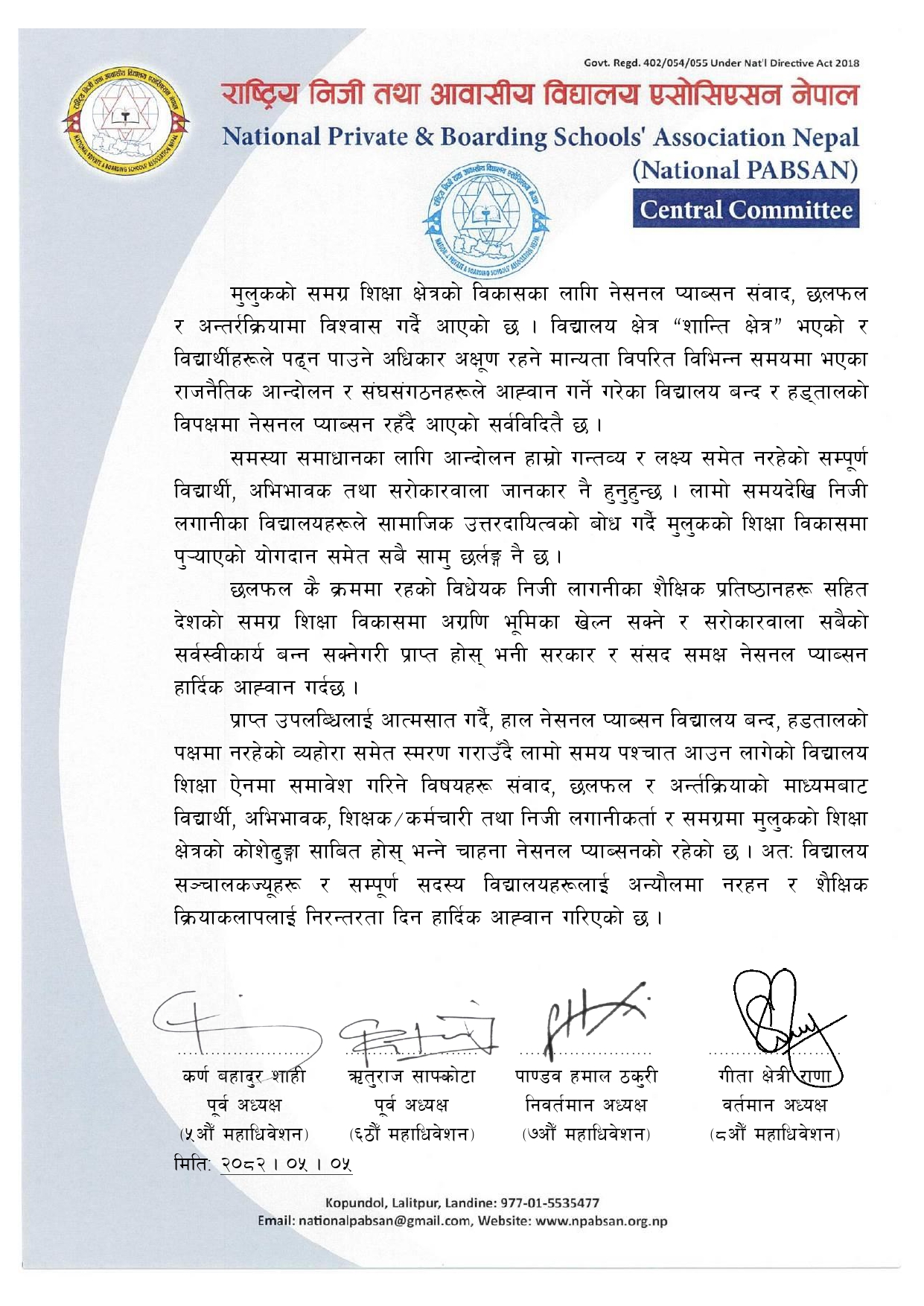 नेसनल प्याब्सनले आज एक विज्ञप्ति जारी गर्दै शिक्षा मन्त्रालय, समितिका सभापति, सम्पूर्ण सदस्य र प्रतिपक्षी सांसदहरूलाई धन्यवाद दिएको छ। विज्ञप्तिमा कम्पनी रजिष्ट्रारको कार्यालयमा दर्ता भएका निजी विद्यालयहरूलाई वर्तमान सञ्चालन प्रक्रियाअनुसारै अघि बढाउने व्यवस्थालाई सकारात्मक भन्दै त्यसप्रति आभार प्रकट गरिएको छ।