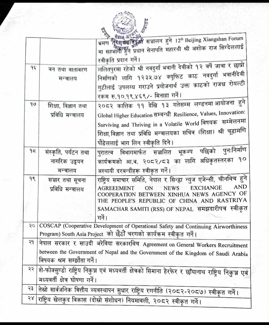 काठमाडौँ – मन्त्रिपरिषद्को भदौ १३ गते बसेको बैठकका २४ निर्णय सार्वजनिक भएका छन् । सोमबार पत्रकार सम्मेलन गरेर सूचना तथा सञ्चार प्रविधि मन्त्री पृथ्वीसुब्बा गुरुङले निर्णय सार्वजनिक गरेका हुन् ।