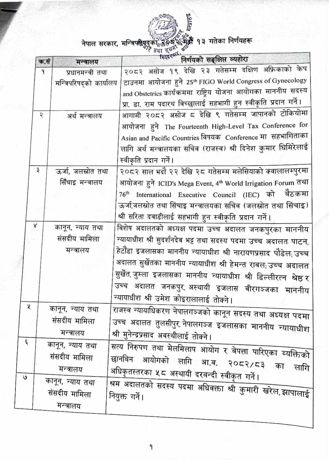 काठमाडौँ – मन्त्रिपरिषद्को भदौ १३ गते बसेको बैठकका २४ निर्णय सार्वजनिक भएका छन् । सोमबार पत्रकार सम्मेलन गरेर सूचना तथा सञ्चार प्रविधि मन्त्री पृथ्वीसुब्बा गुरुङले निर्णय सार्वजनिक गरेका हुन् ।