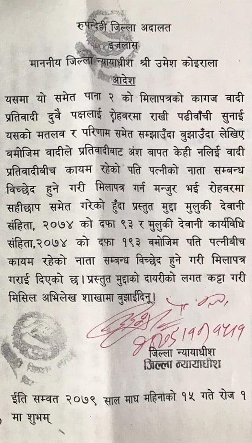 रुपन्देही – रुपन्देही क्षेत्र नं. ३ मा हुन लागेको उपनिर्वाचनका लागि राष्ट्रिय स्वतन्त्र पार्टी (रास्वपा) का उम्मेदवार डा. लेखजंग थापाले पहिलो श्रीमतीसँगको सम्बन्धविच्छेद (डिभोर्स) भइसकेको कागजात सार्वजनिक गरेका छन् । थापाले २०७९ माघ १५ गते जिल्ला अदालत रुपन्देहीमा न्यायाधीश उमेश कोइरालाको इजलाशमा सम्बन्धविच्छेद गरी मिलापत्र भएको कागज फेसबुकमार्फत सार्वजनिक गरेका हुन् ।